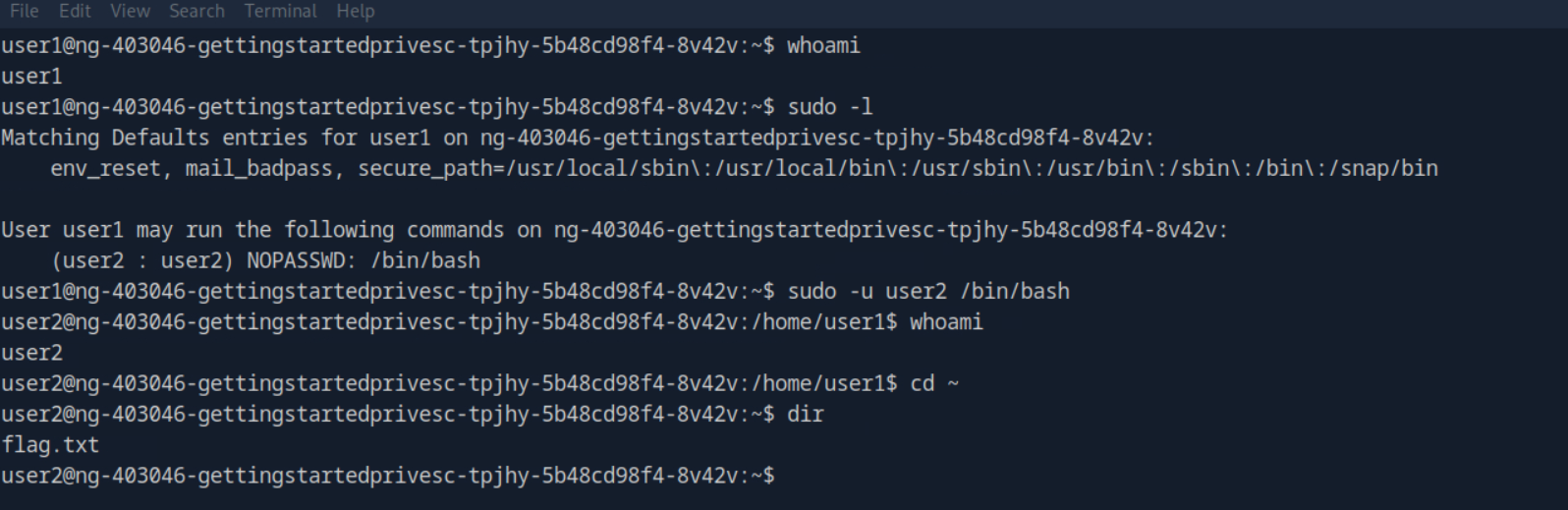 Navigating round the user1 and we found that the User2 /bin/bash file can be accessed without the password which is found by running this command sudo -l